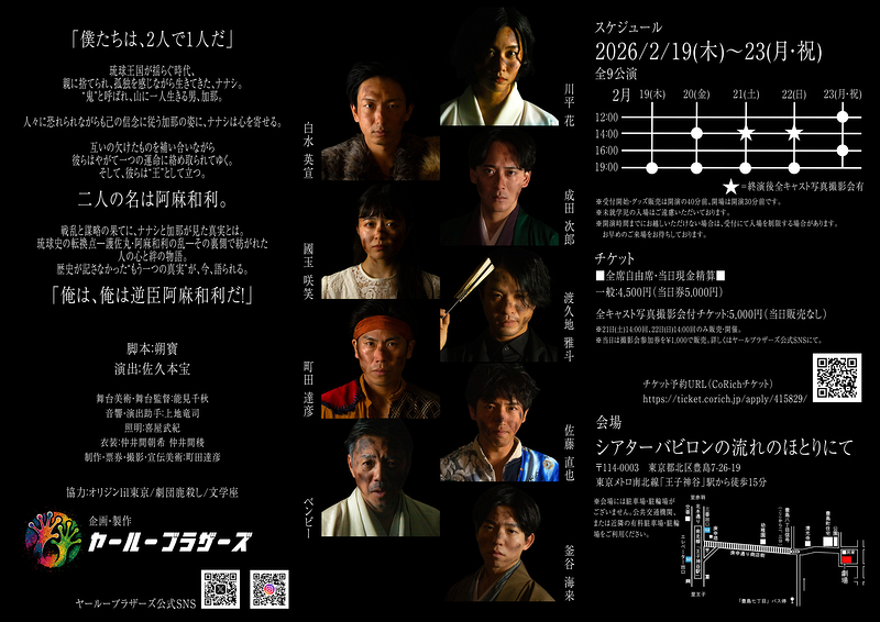 | スタッフ | 舞台美術・舞台監督:能見千秋(ターリーズ) 演出助手・音響:上地竜司 照明:喜屋武紀 衣装:仲井間朝希、仲井間稜 制作・票券:町田達彦 |